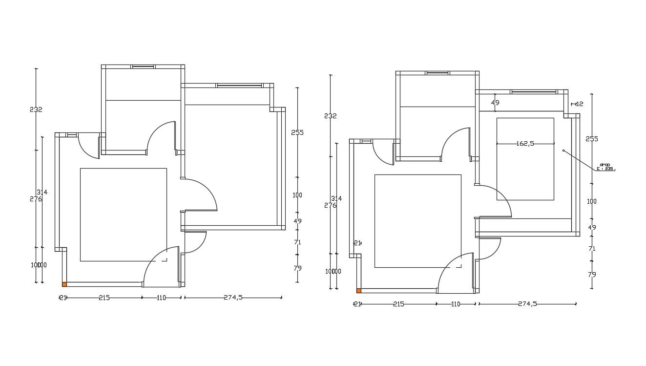 Layout plan of the house which shows the work plan design details of house along with floor level details, dimension details, door window blocks details, and other unit details in house.