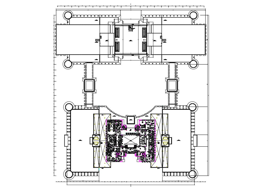 Design plan of a commercial building which shows the building plan along with floor level detail, dimension hidden line detail, compound wall detail, parking space detail, and various other detail.