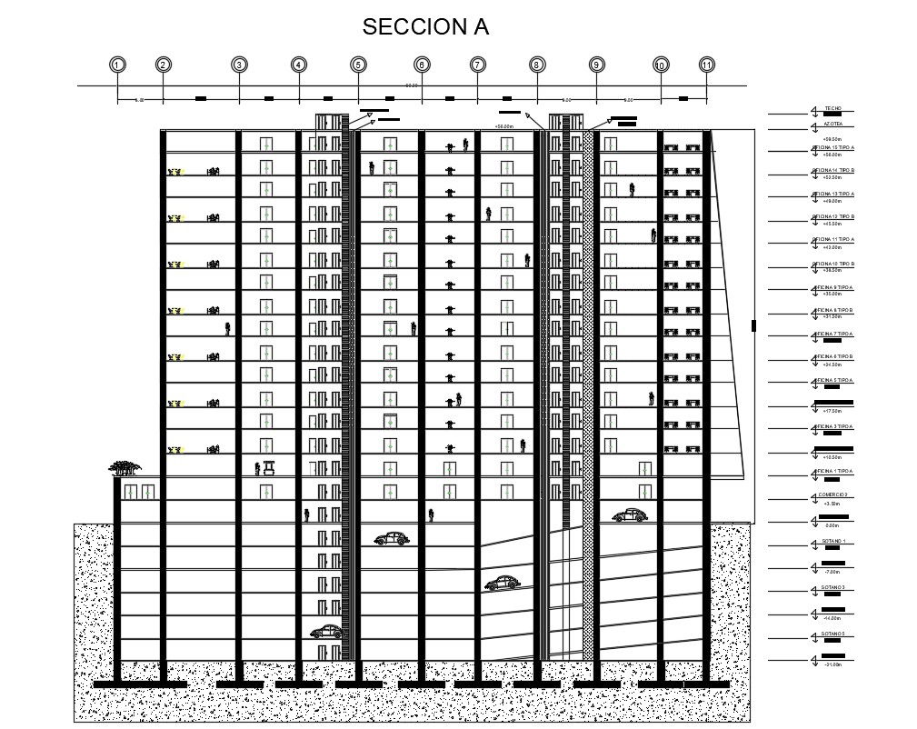 Building Section Plan DWG; 2d CAD drawing of building section plan with dimension detail. download the AutoCAD file of the corporate building project cross-section plan.