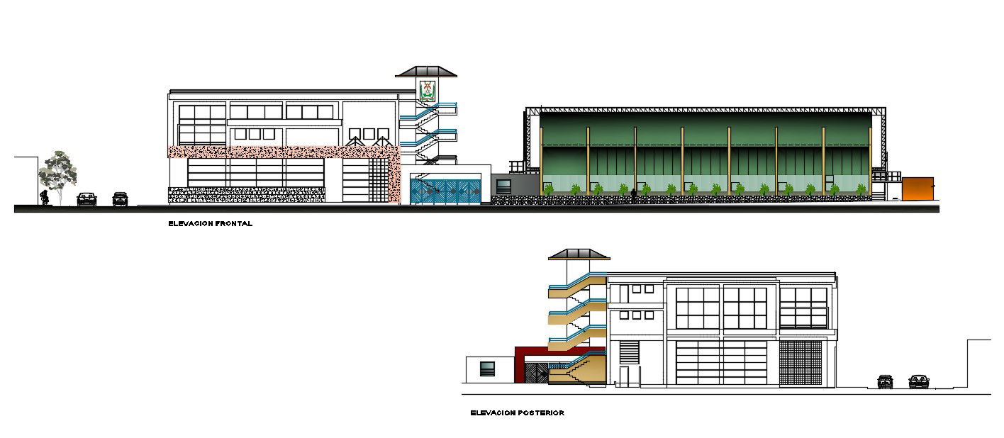 Office Building Elevation Design AutoCAD File; find here front side and back side office building elevation design in AutoCAD format. download office building DWG file and use this drawing for CAD presentation.