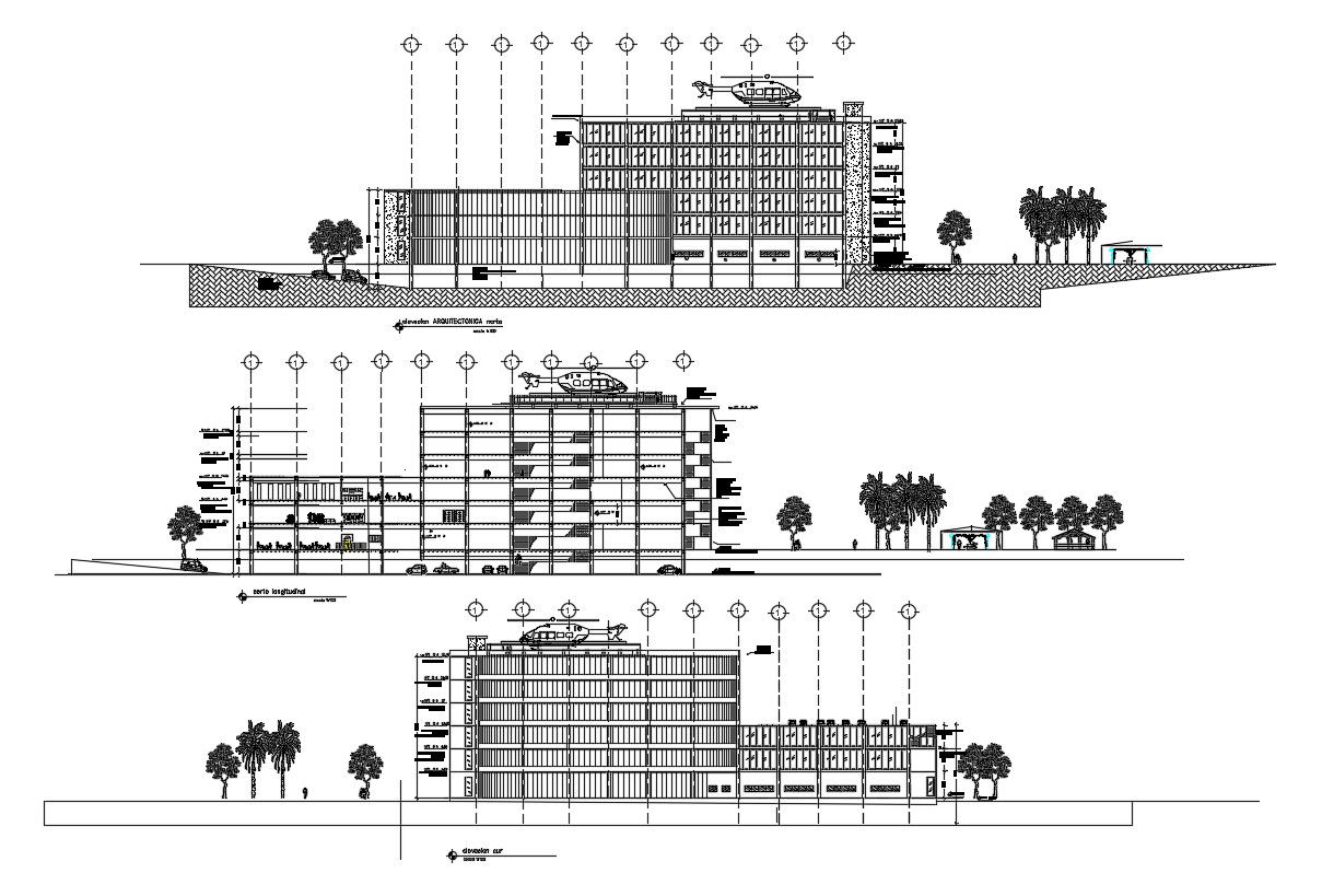 Helicopter Landing Pad On Building DWG File; the architecture building section plan and elevation design of helicopter landing pad on building elevation design DWG file.