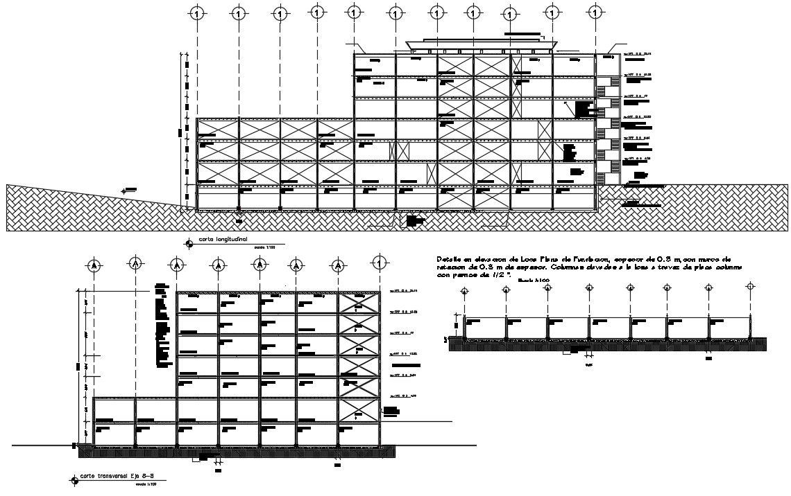 Download Building Section Plan DWG File; the architecture building section plan with dimension detail and necessary description detail in AutoCAD format. Elevation detail of Building Foundation Slab, 0.3 m thick, with retention walls 0.3 m thick. Columns nailed to the slab through column plate with 1/2 "bolts.