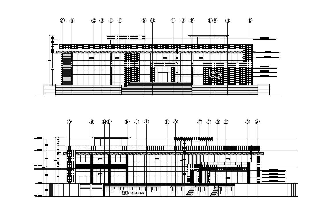 Download hospital building elevation design that shows building front elevation and side elevation detailing.