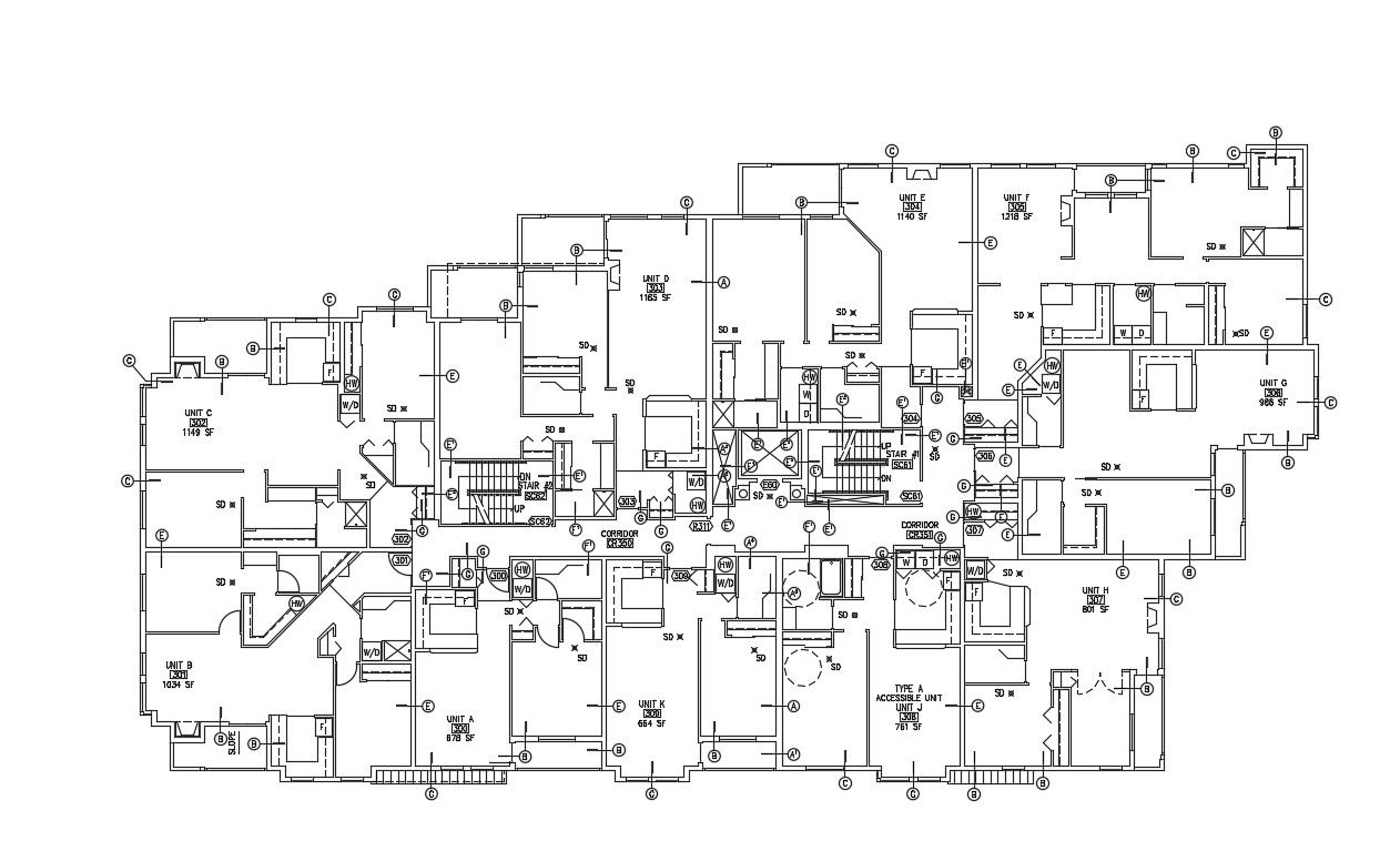 CAD plan design of the building which shows building plan details along with corridor passage details, floor level details, staircase details, and various other details.