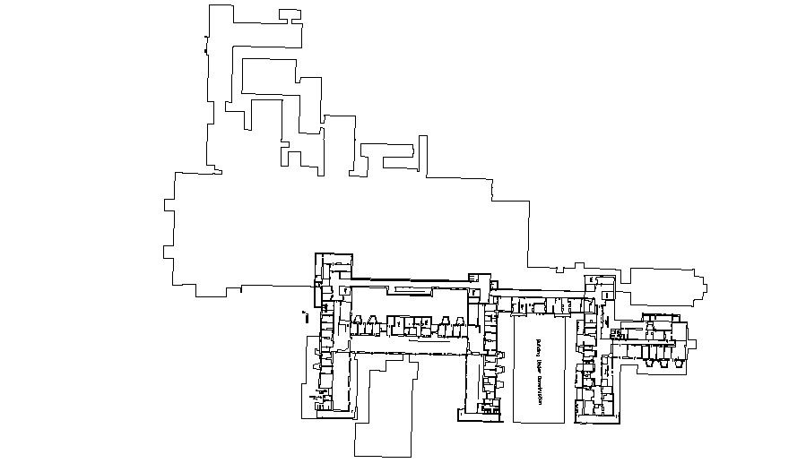 Building plot area designing plan that shows exiting building drawing details along with road networks details, and other details.