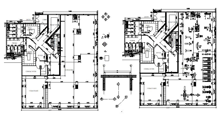 Layout plan design of gym building which shows changing room area details, gym floor area details, yoga floor area details, gyming equipment details, reception area, and building other amenities detail.