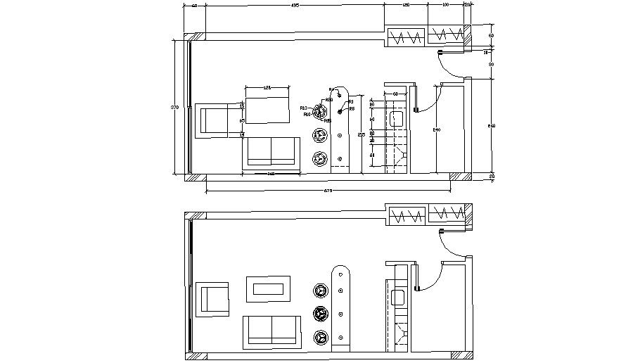 Layout plan design of the living room of the house which shows living room furniture blocks details of sofa-set, table and chair, showcase furniture units, and other details in the room.