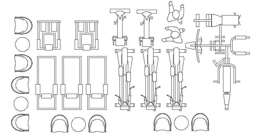 Various gym machinery units elevation CAD drawing download file for free which shows gym machine details of treadwheel, bicycle, leg press machine, and other unit details.