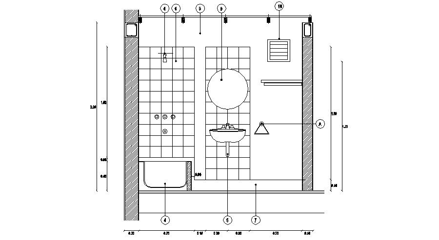 2d elevation details of the bathroom which shows bathroom sanitary ware details of washbasin, bath-tub, and other unit details.