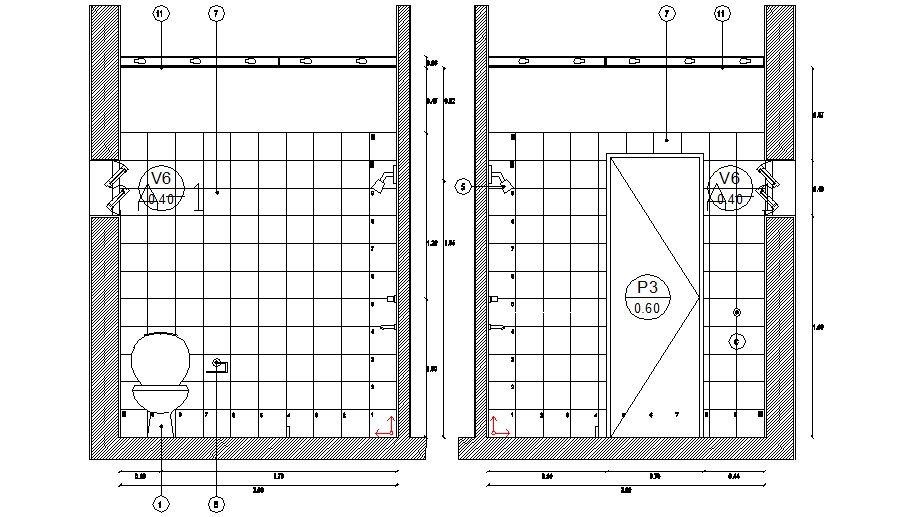 2d elevation detailed drawing of the bathroom which shows water closet, door and vent details, plumbing blocks, shower units, and other blocks details.