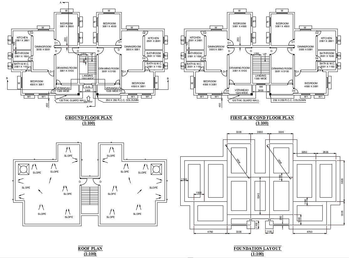 2 BHK Apartment Floor Plan CAD File; the residential building has only two clusters of 2 bhk flat. apartment has a drawing room with a balcony, kitchen, dining 2 bedrooms, 2 toilets. every unit has fully ventilated. also, include RWP drawing and basic foundation layout .