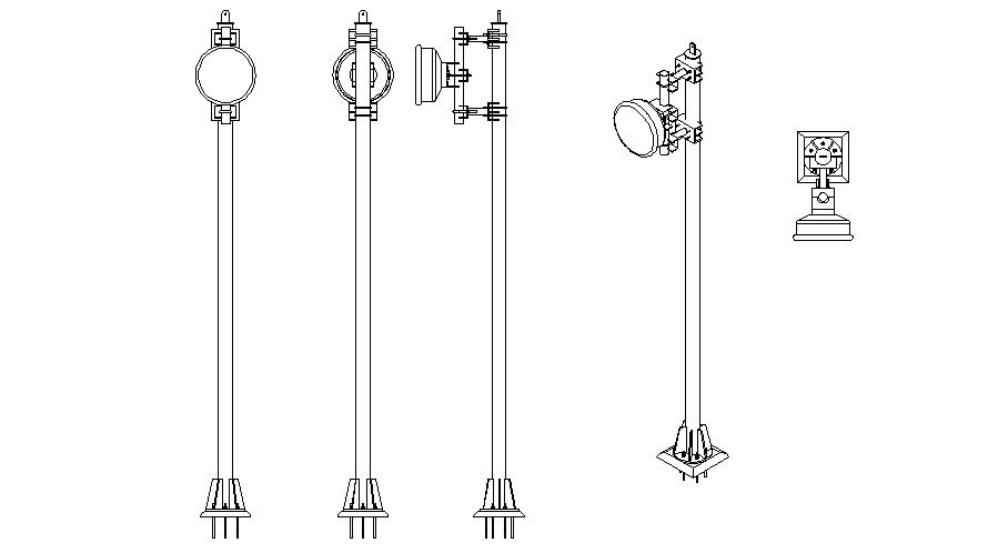 CAD drawing details of lighting lamp post design blocks which shows light pole all sides of elevation in the drawing.