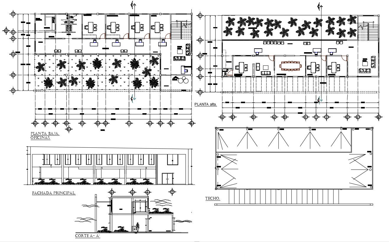 2 Storey Office Building Floor Plan AutoCAD File; find here office building floor plan with furniture detail, section view and elevation design with dimensions and landscaping design. download office building floor plan DWG file and use it for reference CAD drawing.