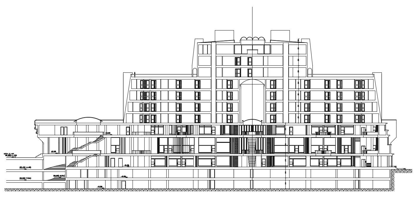 Front Elevation For Commercial Building DWG free download ; the commercial complex sectional elevation with levels demarcation .