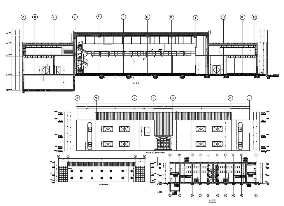 Small Commercial Complex Design CAD File; commercial complex design with elevation ,sections,level demarcation and dimension .free download
