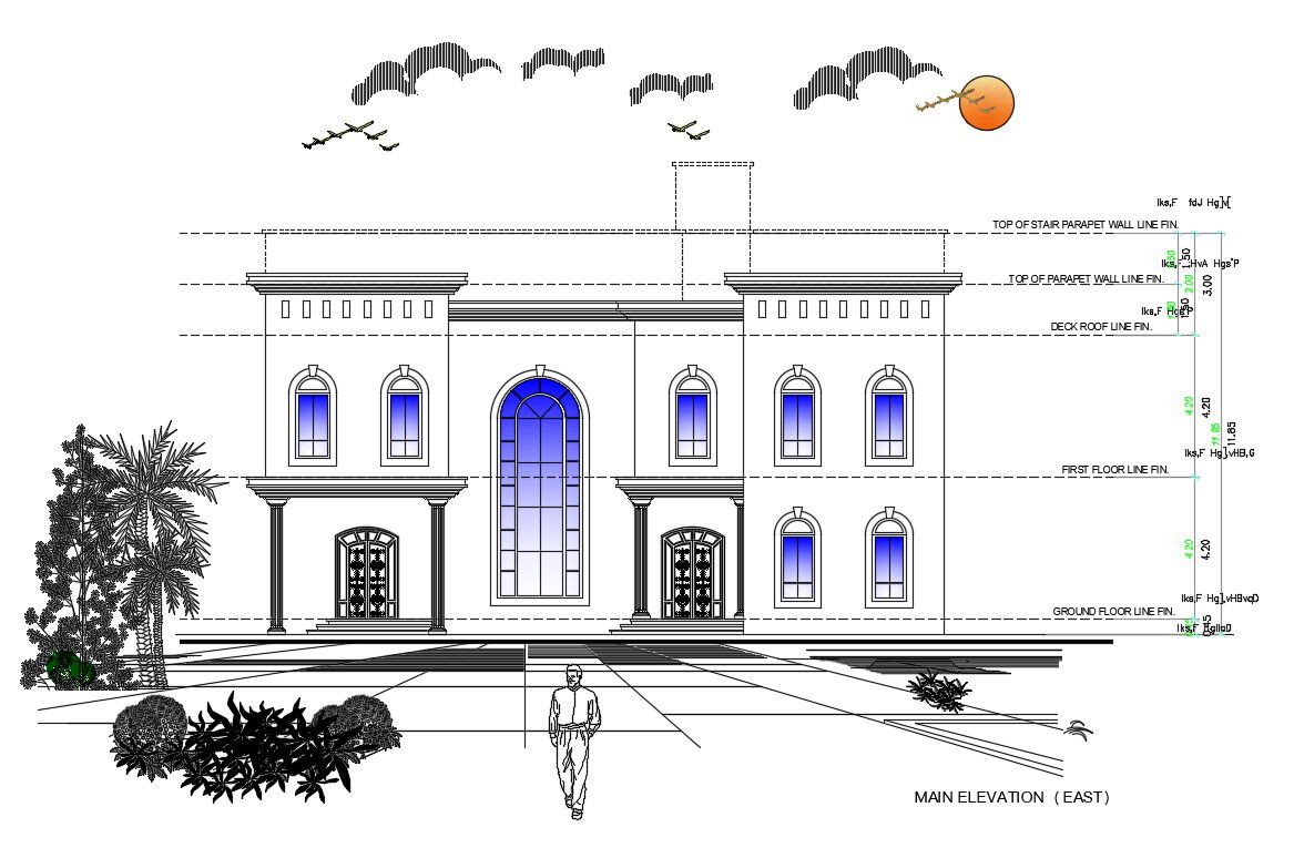 Bungalow Front Elevation Design DWG File ; Front elevation of bungalow with basic landscape, shading and floor levels detail free download.