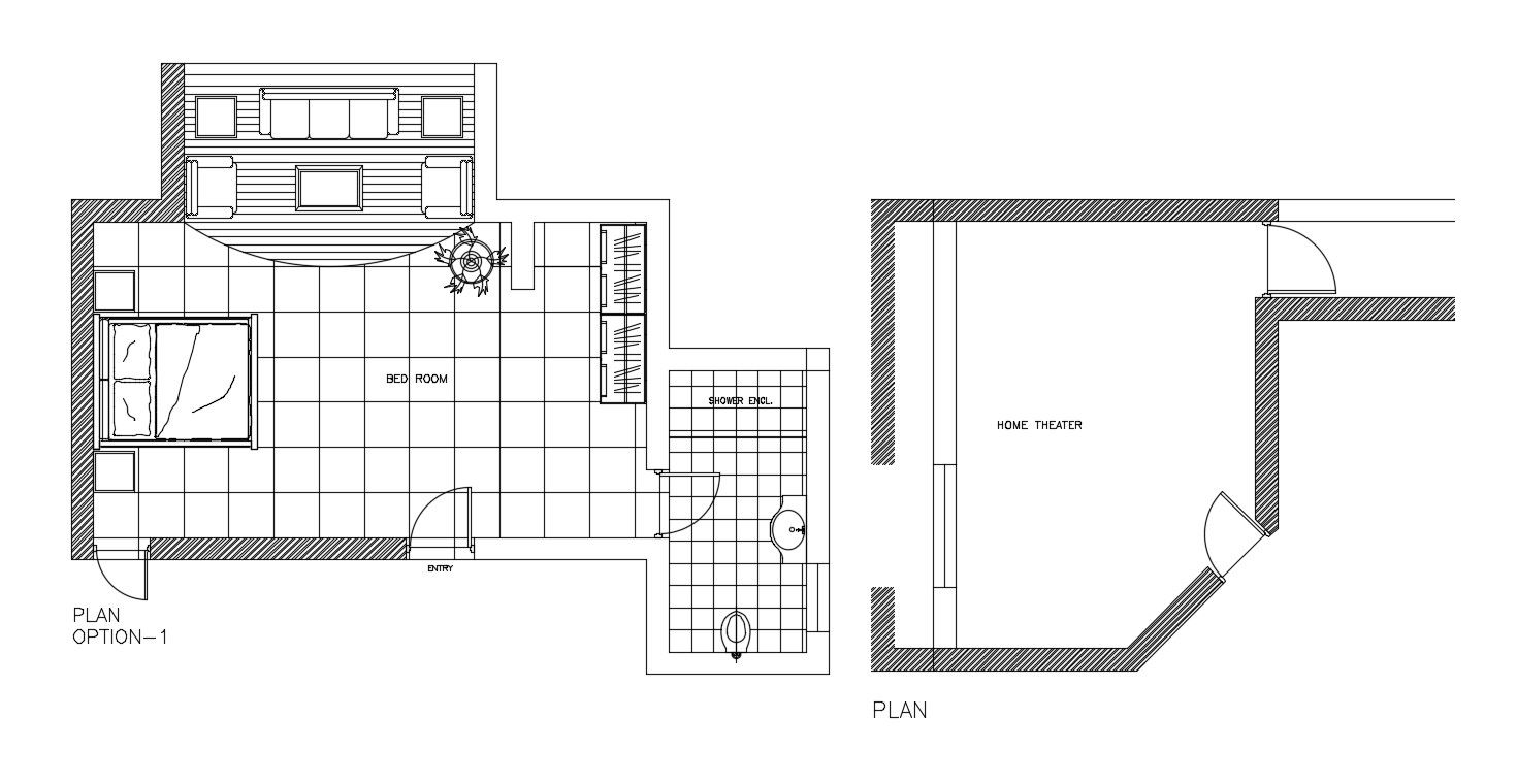 Floor plan design of bedroom which shows furniture blocks details of a double bed, sofa-set, attached sanitary bathroom details download CAD file.