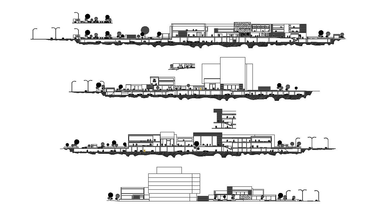 Download CAD drawing details of commercial building design elevation and sectional drawing which shows building floor level detailing, basement parking space details, landscaping details, and various other details.