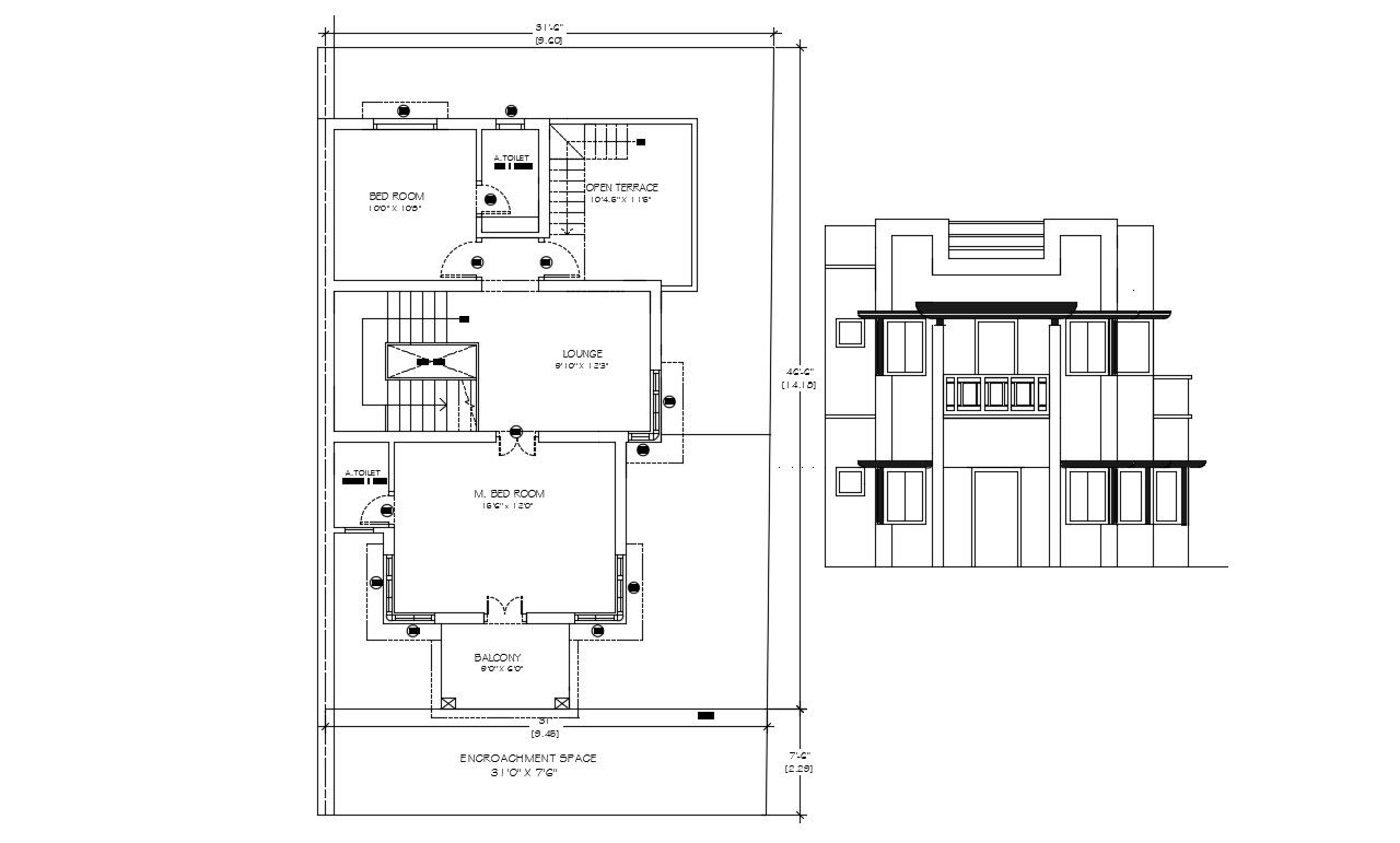 Layout drawing details of the residential house which shows the second floor plan of house along with house front elevation design details.