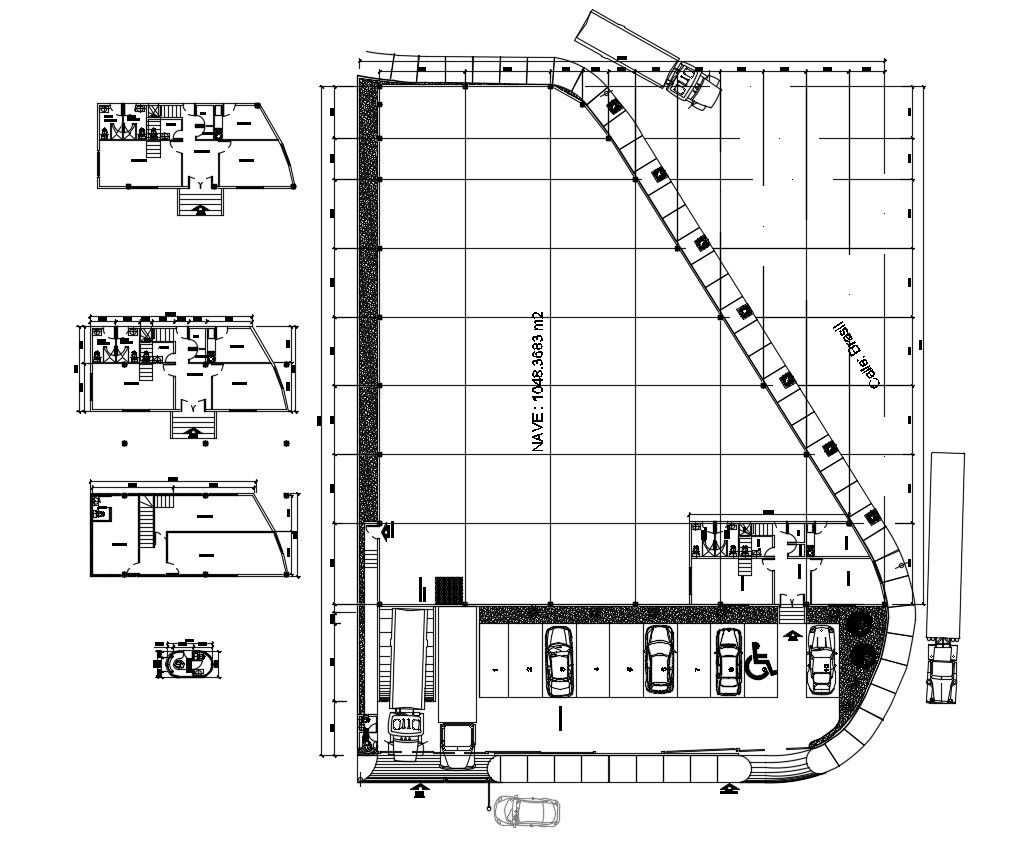 Industrial Plant Building DWG File; 2d CAD drawing of Industrial Plant Building flor plan includes transportation truck, car parking, and building compound wall with dimension detail. download free AutoCAD file of the Industrial Plant project.