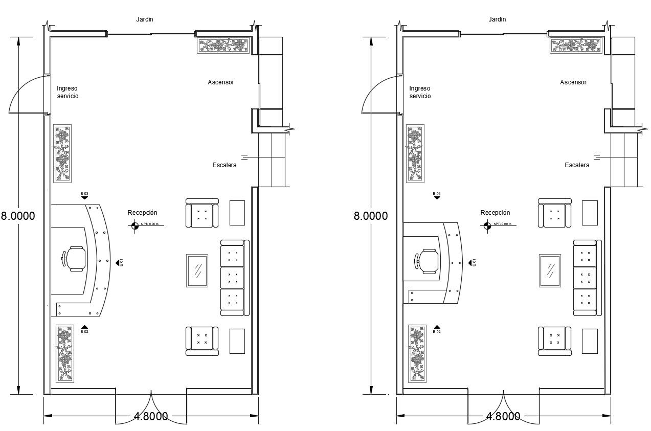 Download Free AutoCAD Reception Floor; 2d CAD drawing of the office building ground floor reception area with furniture plan.