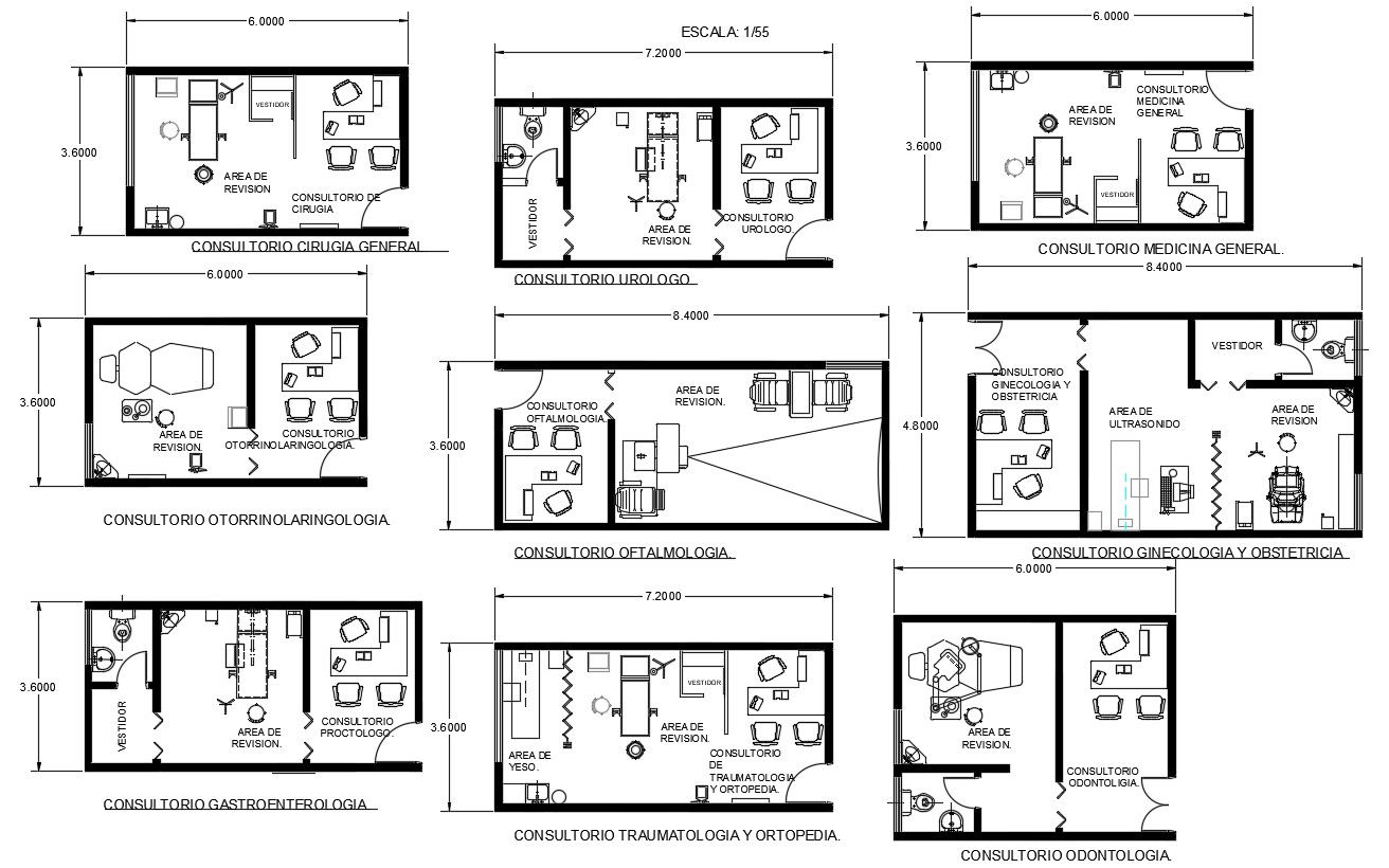 Clinical Otorhinolaryngology DWG File; 2d CAD drawing of clinic plan includes consultant room and check up room with furniture detail and dimension detail.