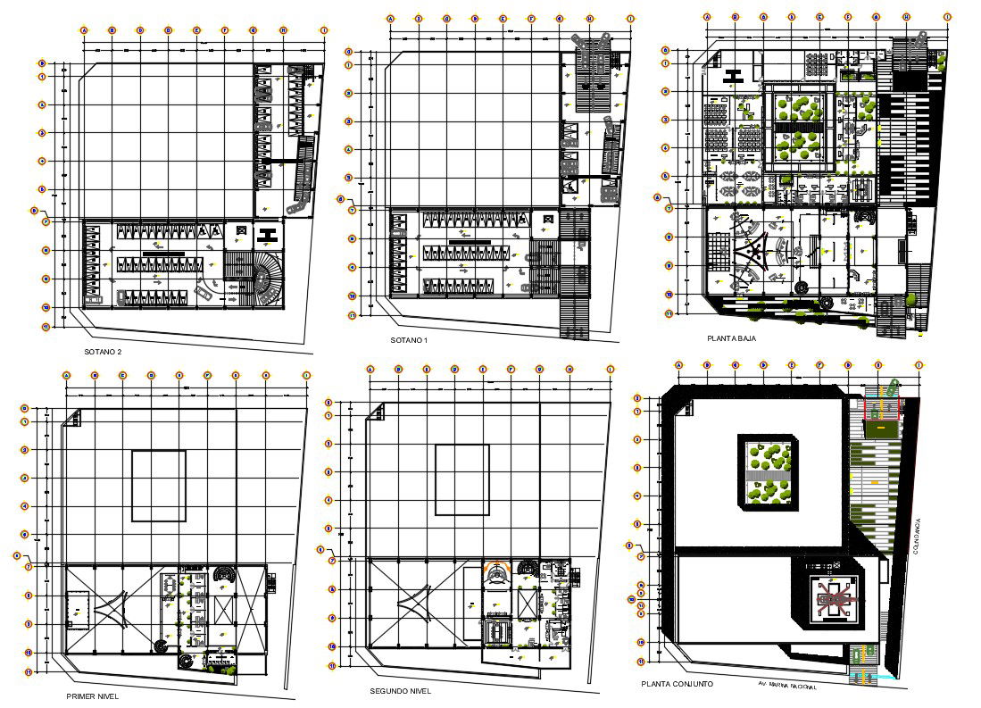 Commercial Building Projects AutoCAD File; the architecture building different floor plan includes 2 basement parking plans and a commercial floor plan with landscaping design. download AutoCAD file of architecture building project with dimension details.