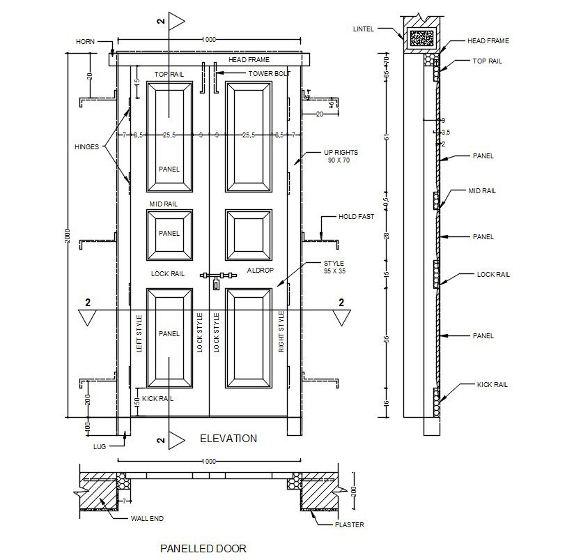 This AutoCAD DWG file provides a detailed drawing of a panelled door, including elevation, section, and plan views with precise dimensions. Perfect for architects, interior designers, and construction professionals, it ensures accurate representation and easy integration into larger architectural plans. The drawing enhances project planning and visualization, helping professionals design functional and aesthetically pleasing interiors.