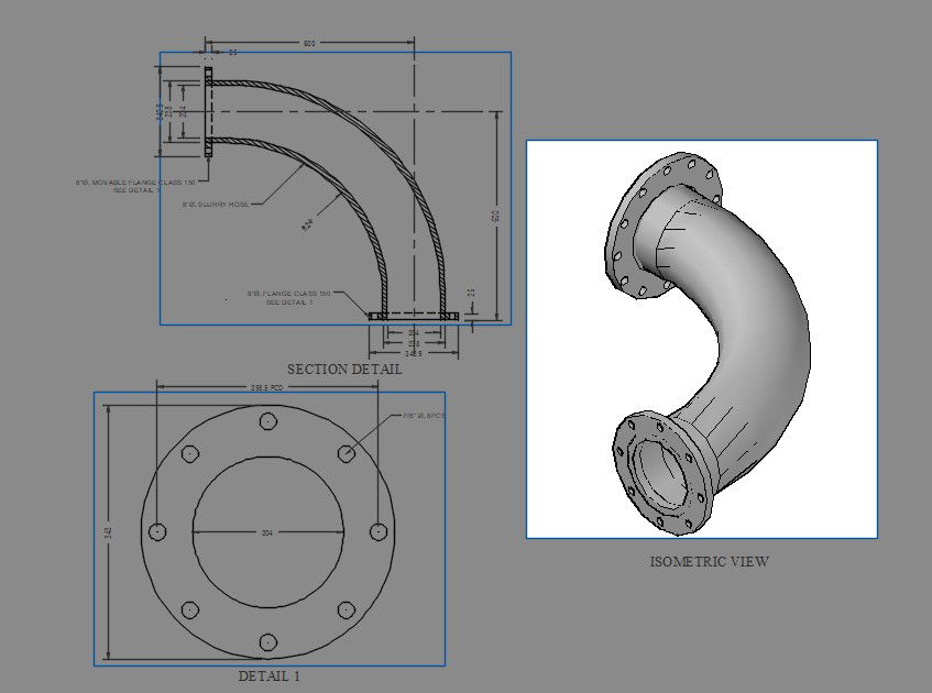 Here is a 3d model for the Slurry hose elbow. kindly see the layout for complete details of the model. Hope this will help you in your drawing.