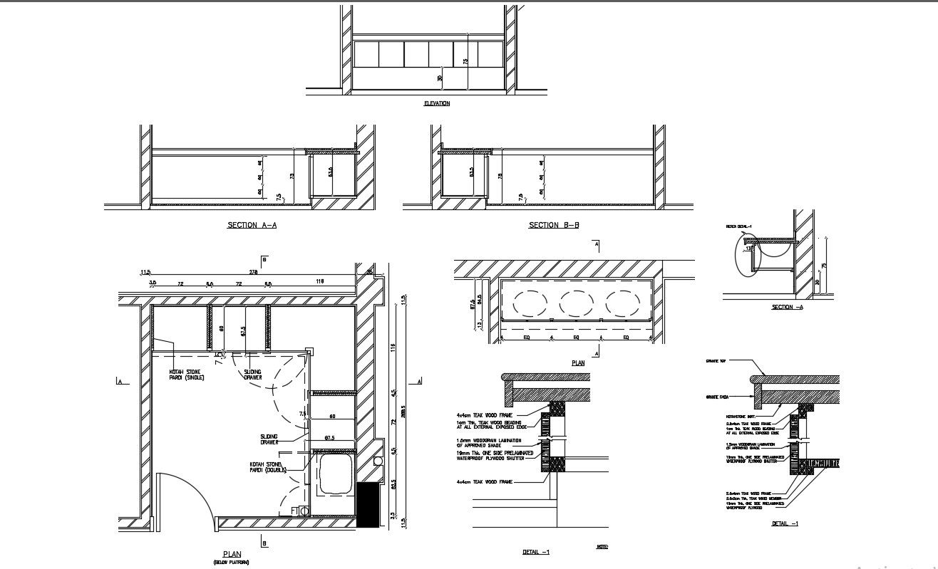Kitchen Interior Autocad File; 2d CAD drawing of floor plan, section plan and elevation design with dimension and description detail in AutoCAD format.