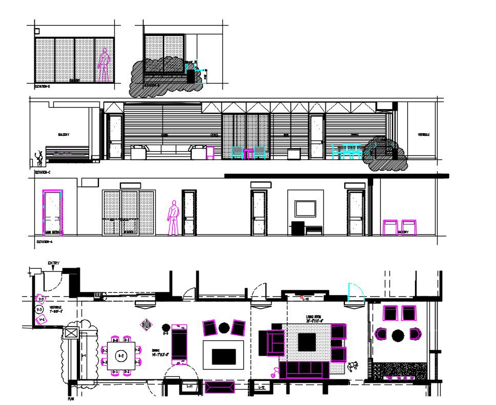 House Project CAD Drawing; the architecture house furnished CAD drawing includes floor plan section plan and measurement detail in AutoCAD format.