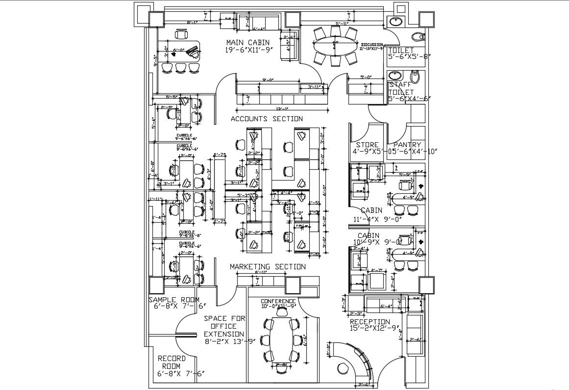 Furnished Office Floor Plan DWG File; the architecture office floor layout plan with d=furniture detail includes reception area, meeting room, main cabin, and working desk with all dimension detail in AutoCAD format. download the architecture office floor plan and use this cad drawing for your new project.
