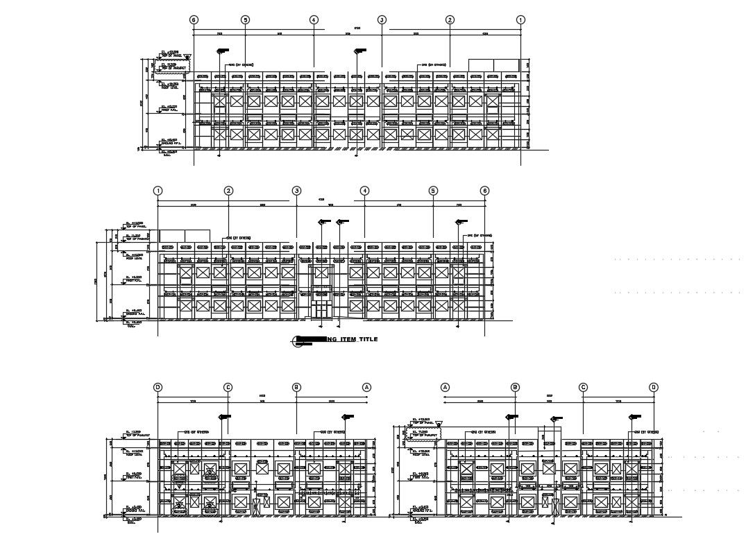 Commercial Complex Elevation CAD File; elevation of commercial with material detail , center line mark in it ,dimension ,levels dwg file free down lode