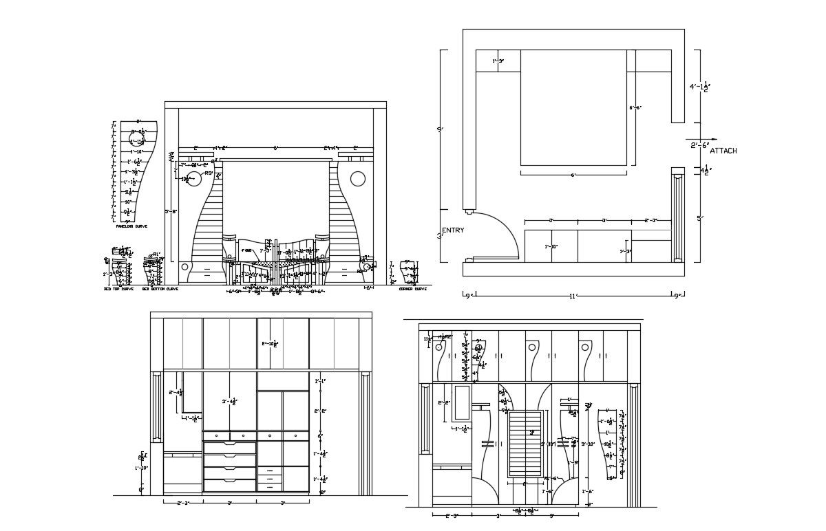 Bedroom Plan DWG File; the interior design of bedroom floor plan and elevation design shows dressing cupboard, bed wall design, and furniture design with dimension detail. download AutoCAD furnished bedroom design.