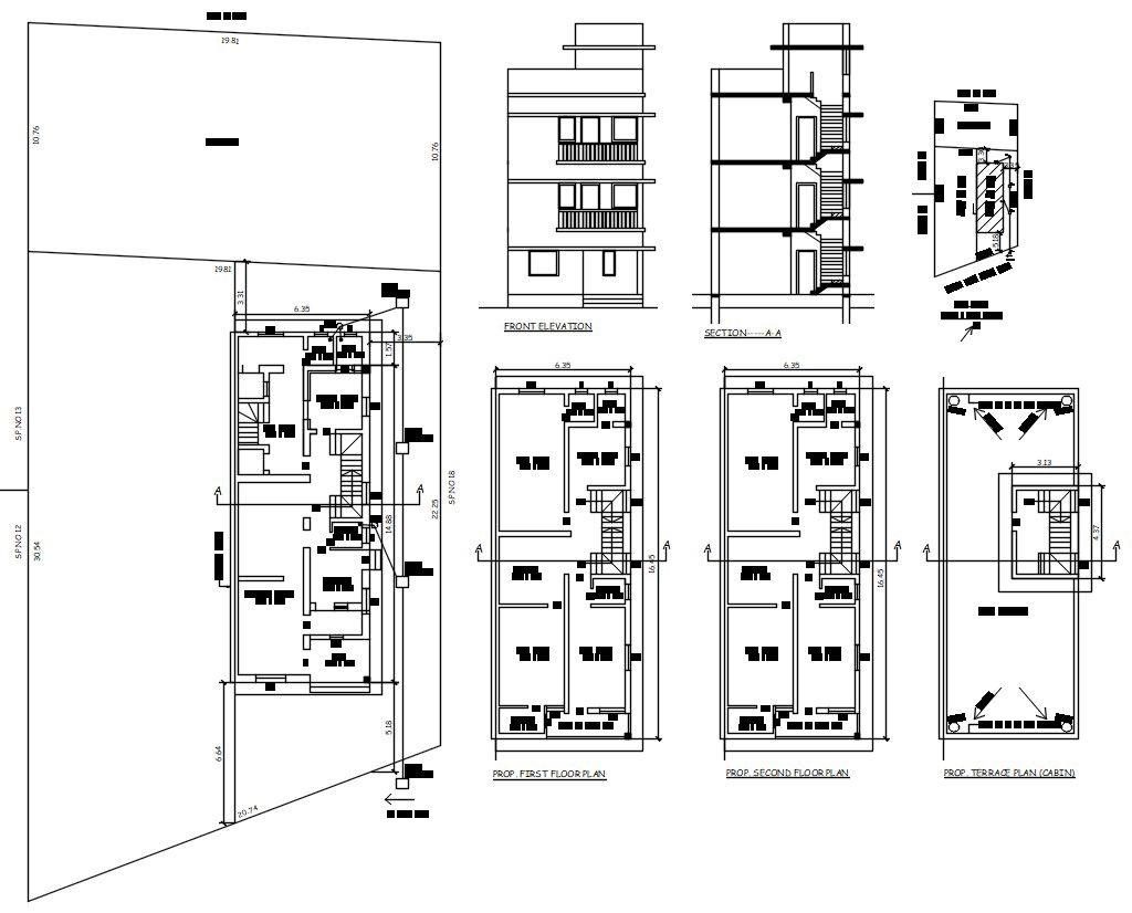 3 Storey House AutoCAD File; the architecture house floor plan, site plan, section view and elevation design with dimension and description detail in AutoCAD format. download multifamily house project DWG file.