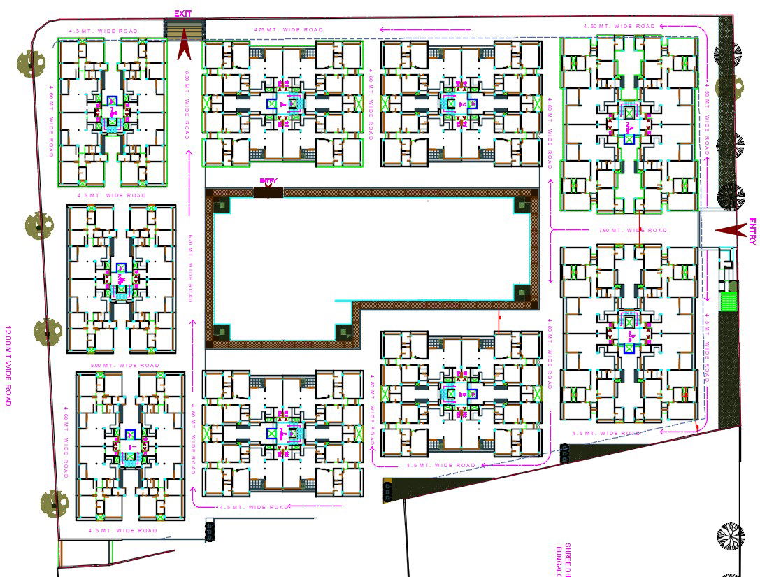 2 BHK Apartment Floor Plan DWG File; the architecture residence apartment floor plan includes different flat bloks, central garden, entrance and exit way. download the AutoCAD apartment project with landscaping design.