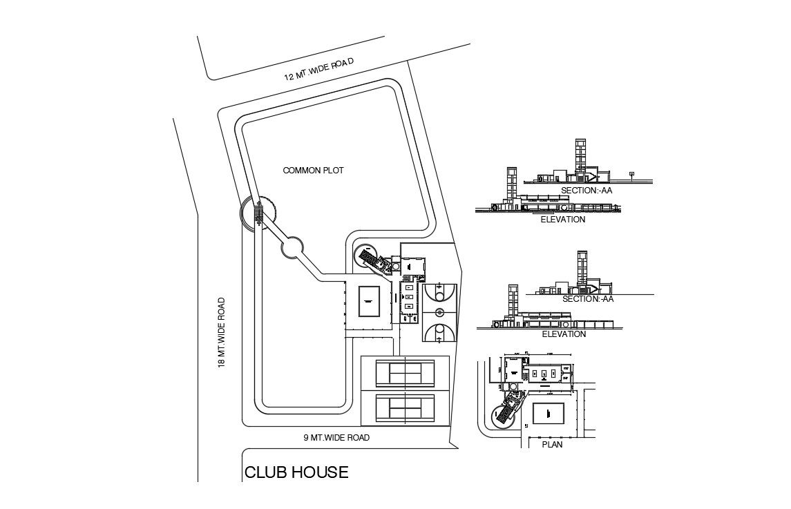 Layout master plan design of clubhouse with section and elevation details of the building, sports playgrounds details, parking space, garden area, and various other details presented in CAD drawing.