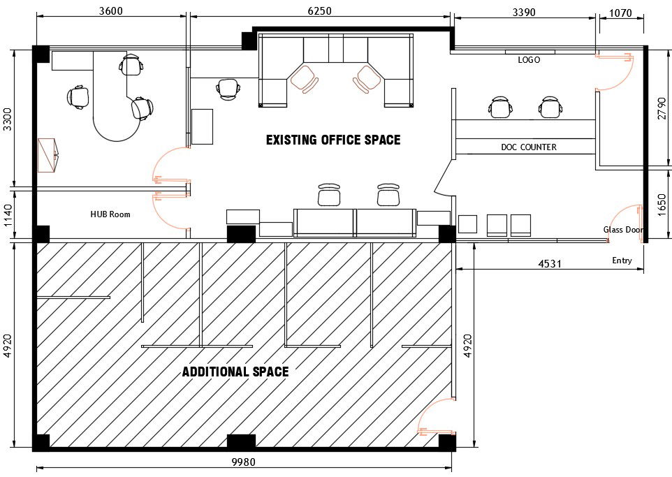 Layout plan design of office building which shows furniture details in the office along with dimension details, floor level details, and other details of office room.