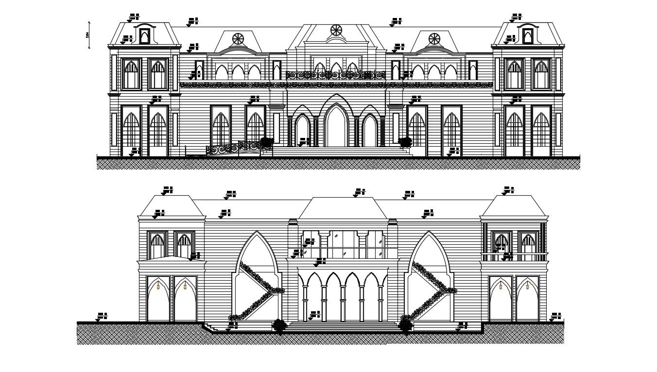 House Front Elevation Designs For Double Floor DWG File Download ; two elevation of bungalow with detail include expose wall material ,huge opening ,door-window,stair stair elevation, leveling detail DWG File Download