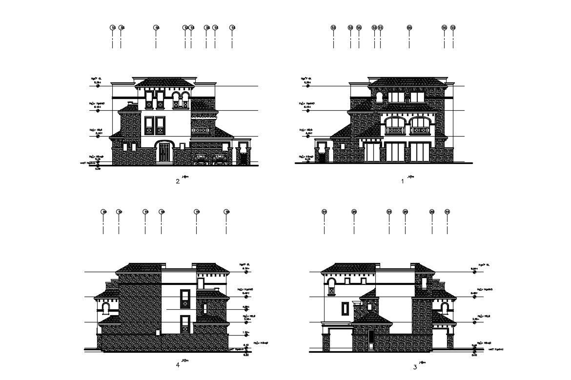 Building Elevation DWG File Free Download ; bungalow elevation design , all side elevation , include levels and reference line AutoCAD free file download