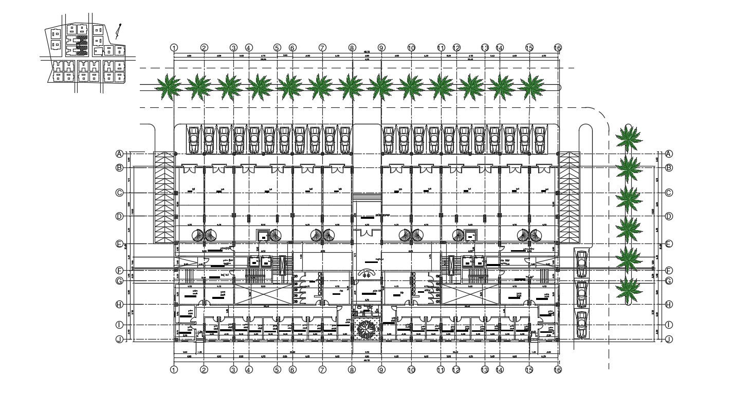 Commercial Complex Floor Plan DWG File Free Download ;commercial plan with big show room ,shop, stair lift ,ramp outside,also include center-line ,working dimension ,texting spiral stair, some outside parking and landscaping ,key plan
