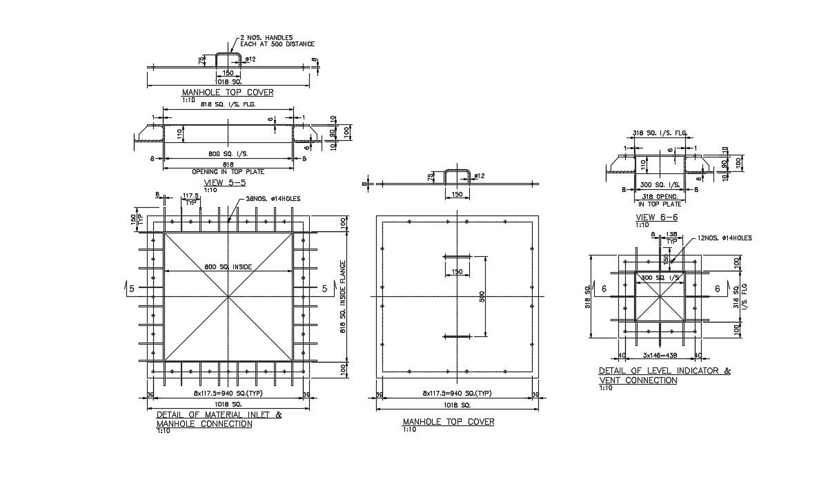 Manhole Design CAD Free File Download ; detail of manhole ,include section ,plan ,top detail, texting , dimension , views , detail of material inlet and manhole connection free cad file download .