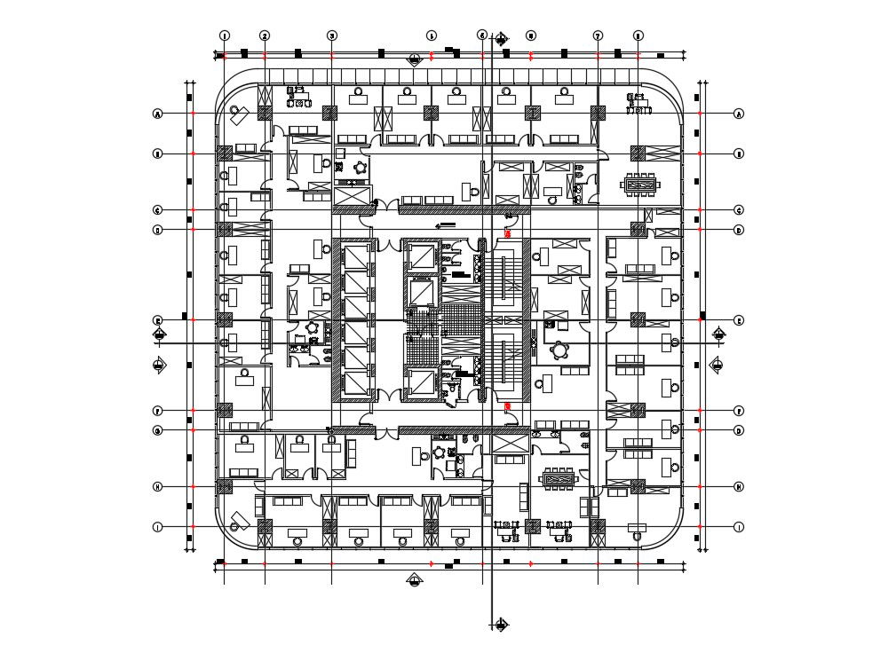 Commercial Building Floor Plan CAD File Free Download ; commercial office planning include center line , dimension, furniture layout, toilet block ,stair detail , lift block AutoCAD file free download