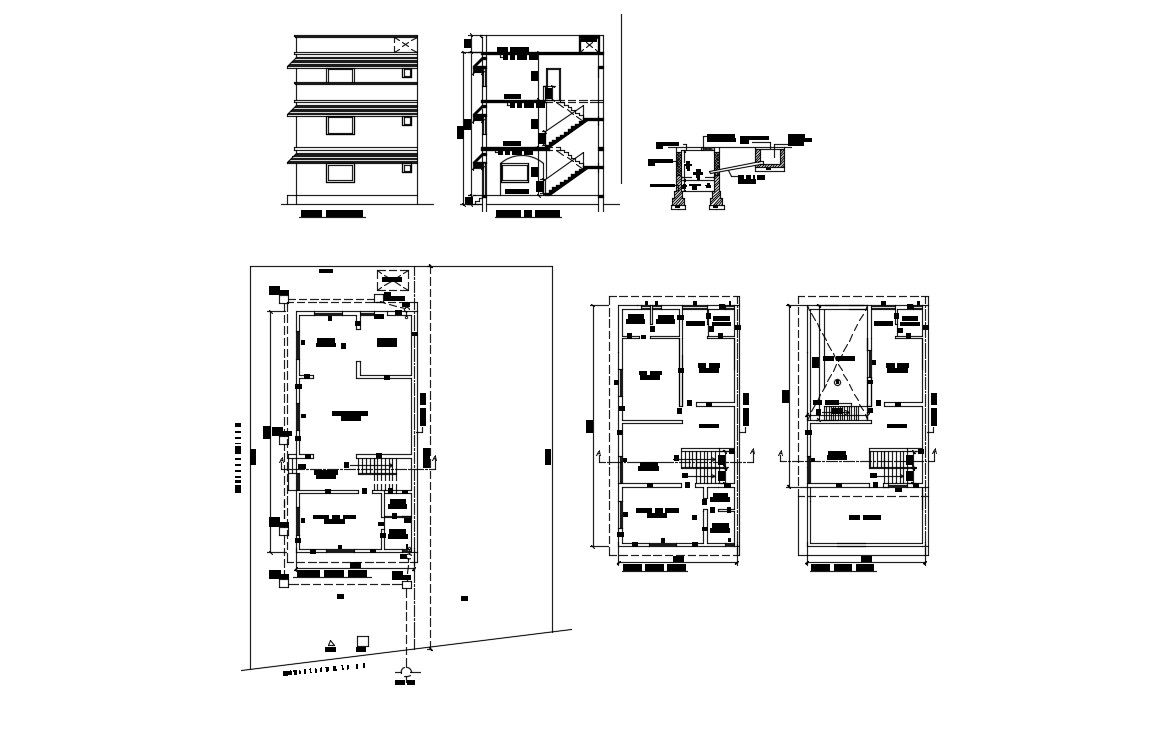 Layout plan of residential house design plan elevation and the sectional drawing shows the floor plan of the house along with house floor level details, staircase details, footing details, and various other details included in CAD drawing download.