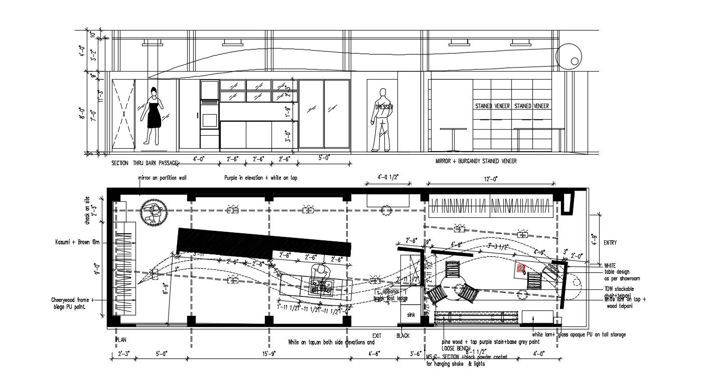 CAD drawing details of showroom building design plan and the sectional drawing shows pantry area details, working area office room details, furniture details in the room, dimension, and various other details download file for detailed drawing.
