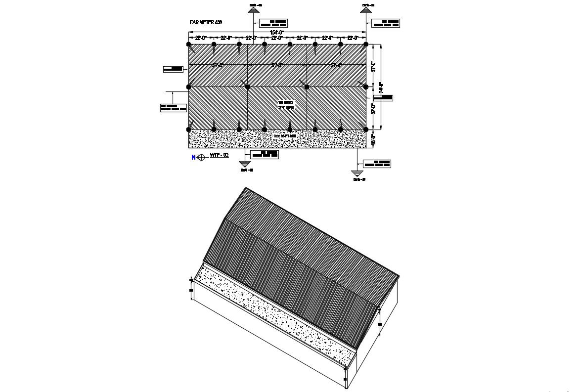 Roof Plan Details CAD File Free Download ; top view of building detail include some text, dimension , hatching with floor plan and 3D view . free DWG file download