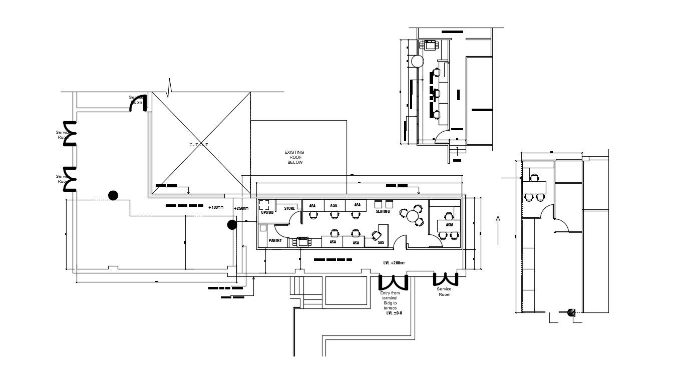 Floor plan design of the commercial building that shows furniture details in rooms along with office wards and cabins details, pantry area details, dimension, floor level, and various other details.