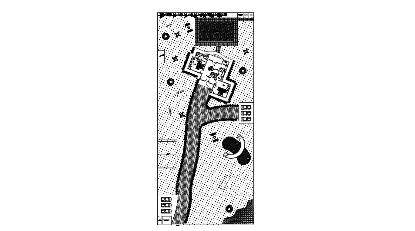 Layout drawing of clubhouse design that shows clubhouse furniture layout plan along with nearby area detailing of garden area, parking space, swimming pool, and other amenities details download CAD drawing for more details.