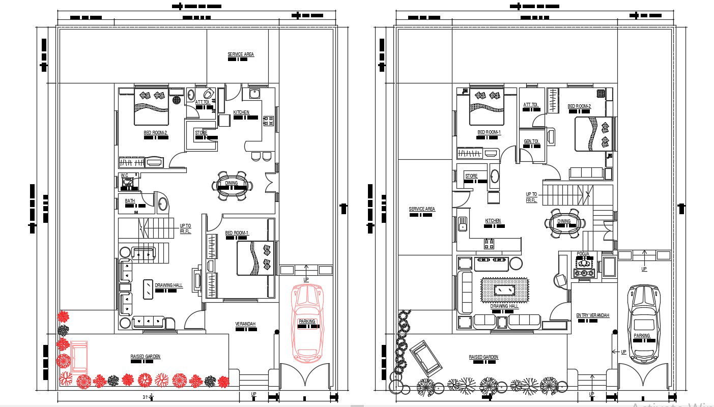 Bungalow Design DWG File Free; modern bungalow planning include furniture layout , texting , size , door window detail ,landscape detail and many more CAD file free