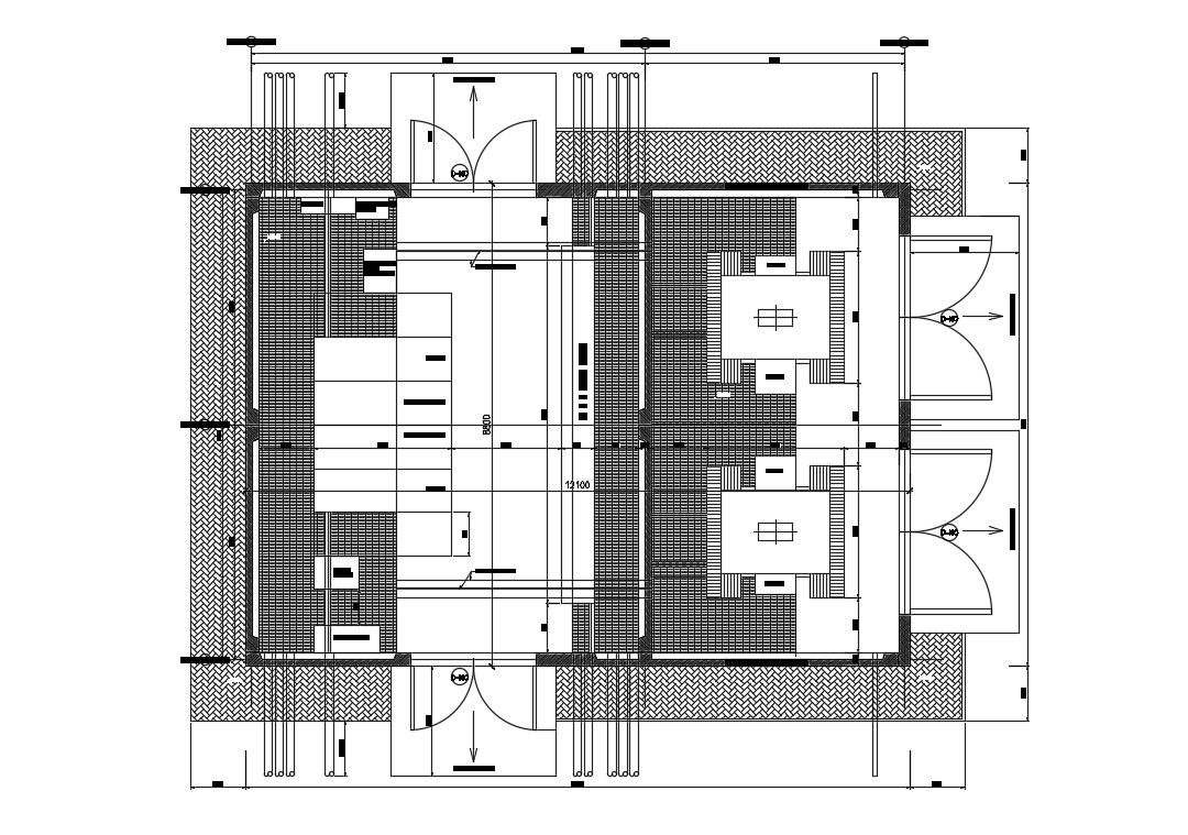 Multipurpose Hall Plan With Dimensions DWG File; 2d CAD drawing of multipurpose hall floor plan with 4 entrance door and furniture hatching detail.
